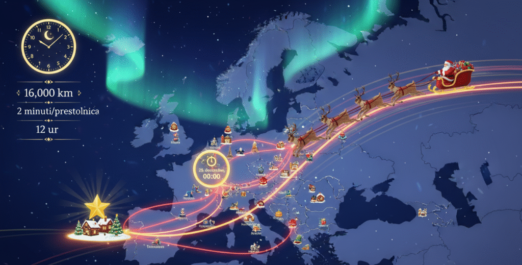 Pri tem pomislite, da ima do Slovenije približno 40.000 kilometrov, njegova hitrost pa je lahko zelo različna – odvisno od hitrosti jelenčkov in prazničnega vetra! 💨